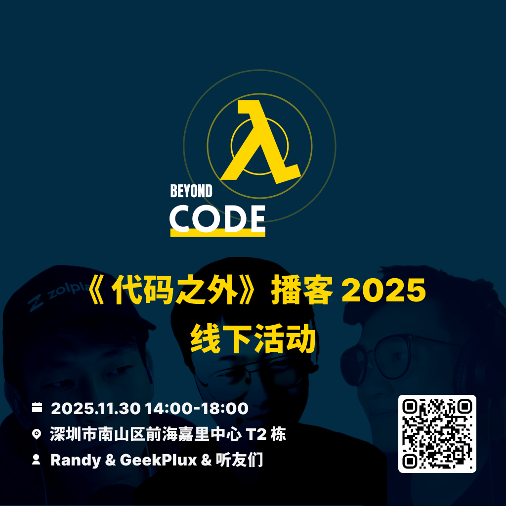 我们即将 2025 年 11 月 30 日在深圳举办《代码之外》播客 2025 线下活动,和听友们见面聊天。到时主播 Randy 和 GeekPlux 将会到场和听友们一起互动。